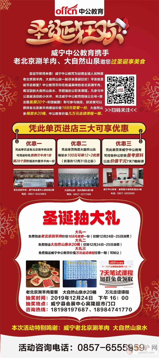 威宁中公教育联合大自然山泉和威宁老北京涮羊肉推出圣诞大抽奖,详情请咨询威宁中公教育。各种优惠、各种免费任你选。wMjq