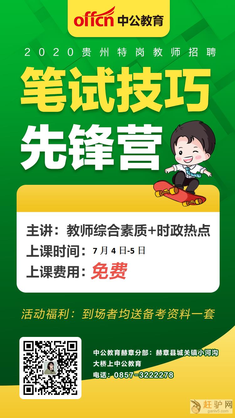 2020年贵州特岗教师招聘笔试技巧先锋营主讲内容:教育综合知识上课时间:7月5日-6日上课费用:免费上课地点:赫章县城关镇小河沟大桥上中公教育活动福利:到场者均赠送备考资料一本需要的同学扫码图中二维码...